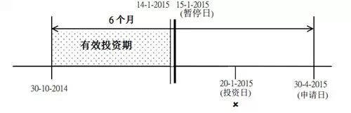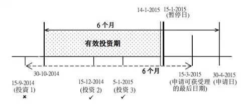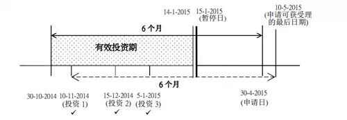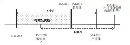 由于申请人在暂停日前已投资不少于1,000万港元,而有关投资是在递交申请前的六个月内完成,因此有关申请符合「过渡安排」的规定,仍会获受理。而根据「过渡安排」的规定,如申请人于2015年6月15日或以前递交申请,则该申请仍会获受理。